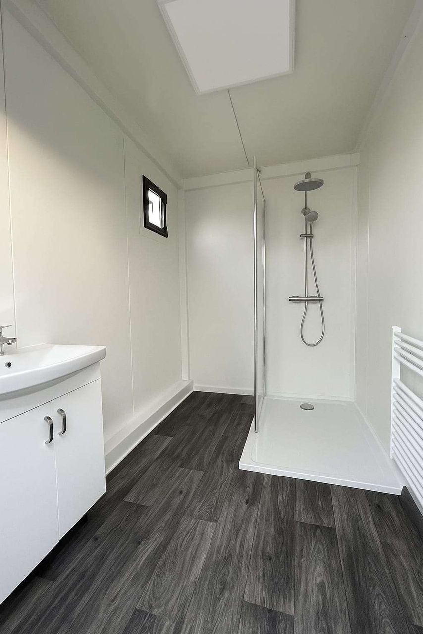 Il modulo è dotato di un bagno completo con doccia e di un WC separato, offrendo privacy e funzionalità. Il sistema di scarico elettrico assicura un’evacuazione efficace e moderna delle acque reflue.